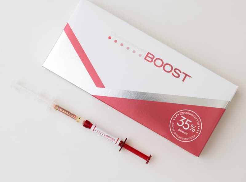 当院が採用しているオフィスホワイトニング用ホワイトニング剤「オパールエッセンスBOOST」は、過酸化水素を35%含む高濃度タイプです。シリンジという容器内で薬剤を混合してから歯に塗布します。基本的には光照射を行う必要もありません。
